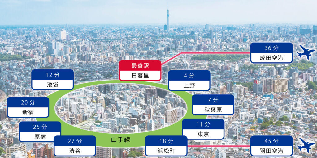 最寄の日暮里駅は、JR、京成本線、日暮里・舎人ライナーが乗り入れ、都心へも、郊外へもアクセスしやすい駅です。京成スカイライナーを利用すれば、日暮里から成田空港まで36分で移動ができます。